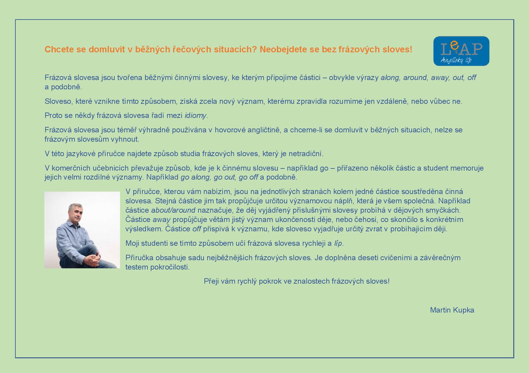 Příručka je určena pro všechny studenty, kteří si chtějí rychle osvojit základní sadu frázových sloves, která patří mezi nejpoužívanější v každodenním běžném kontaktu. Obsahuje 14 tabulí s vyobrazením frázových sloves, 10 cvičení k upevňování znalostí a závěrečný Progress test s klíčem. Použitá metoda výuky, kterou jsem sám vymyslel, se mi osvědčila daleko více než metody používané v komerčních učebnicích.