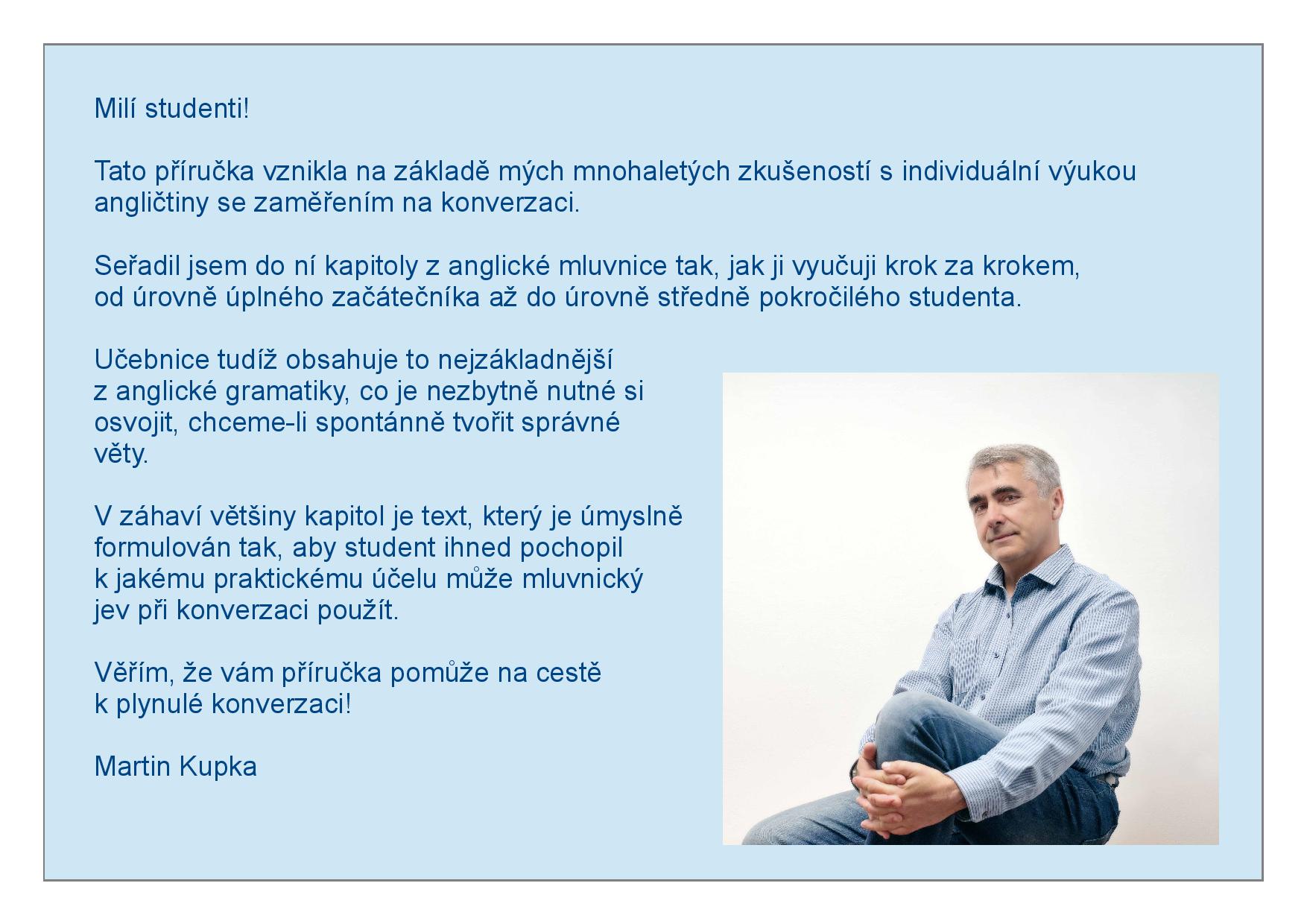 Mluvnice angličtiny líp Posted on August 23, 2019August 23, 2019 by mkupka Příručka nabízí jednoduchý výklad 40 mluvnických jevů, které jsou nezbytné pro zvládnutí anglické mluvnice. Je ideální učebnicí pro falešné začátečníky a mírně pokročilé začátečníky. Je skvělým pomocníkem pro žáky na druhém stupni základní školy a studenty středních škol, kteří dohánějí, co se na základní škole nenaučili. obálka Mluvnice angličtiny líp Úvod Mluvnice angličtiny líp ukázka jedné z kapitol Mluvnice angličtiny líp Ceník: Anglická mluvnice líp – v papírovém provedení, formát A5, kroužková vazba – 200,-Kč Objednávat můžete na e-mailové adrese : martin.kupka@volny.cz Příručky obdržíte buď elektronickou poštou (eBooky) nebo konvenční poštou (papírové provedení) po zaplacení. K platbě za papírové provedení bude připočteno i poštovné. Platba se provádí převodem z vašeho účtu na můj účet číslo: 3638330504/5500. Share this: Share on X (Opens in new window) X Share on Facebook (Opens in new window) Facebook Like Loading... Related